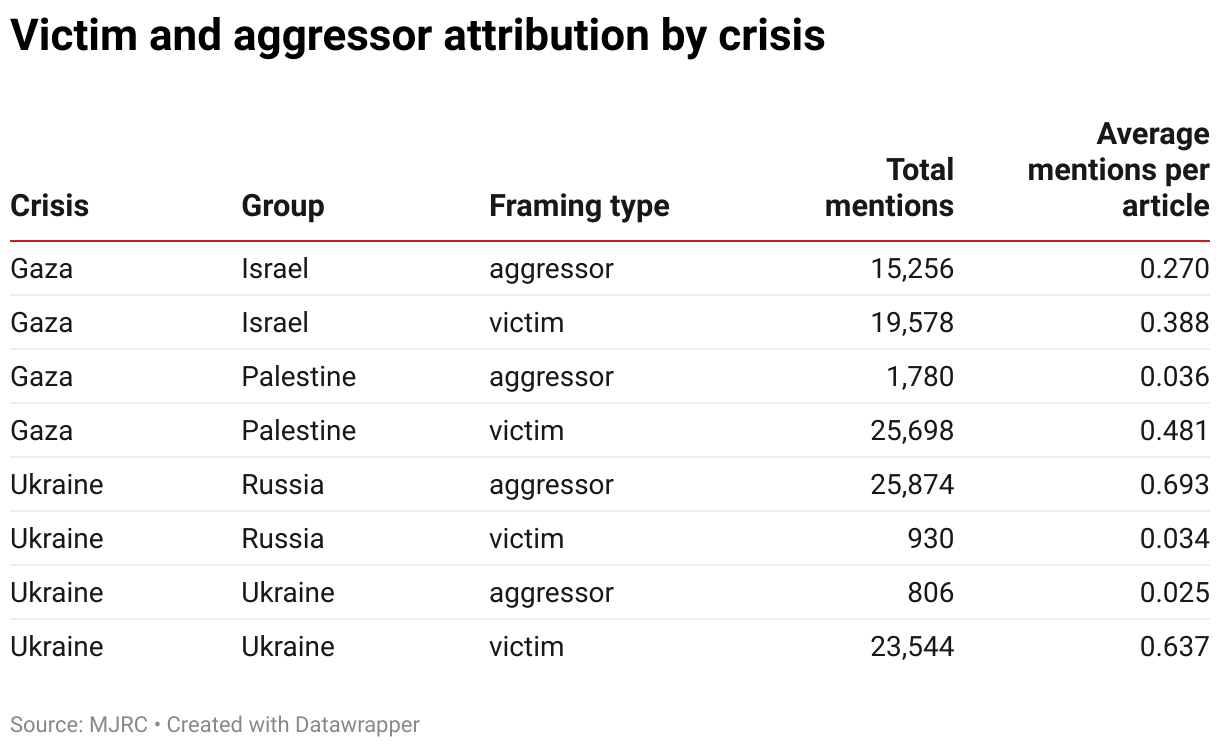 A core finding from this analysis is the asymmetric attribution of victimhood and causality in media representations of the Ukraine and Gaza conflicts. Drawing on data across major outlets, the results show a consistent pattern: Ukraine and Gaza/Palestine are predominantly framed as victims, while Russia and Israel are more frequently portrayed as aggressors.