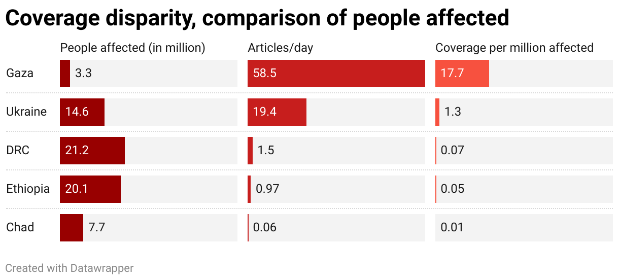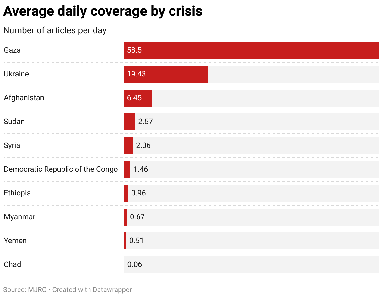 Gaza and Ukraine received dramatically more media attention than other crises, even those with larger affected populations or longer durations. On average, Gaza coverage was nine times greater than Afghanistan, and 60 times greater than Ethiopia. Ukraine coverage was three times higher than Afghanistan, and 20 times higher than Ethiopia. This disparity cannot be explained by humanitarian impact alone. Afghanistan, Ethiopia, and the Democratic Republic of the Congo have all experienced mass displacement, famine, and civilian casualties at comparable or greater levels. Yet these crises are consistently underreported.