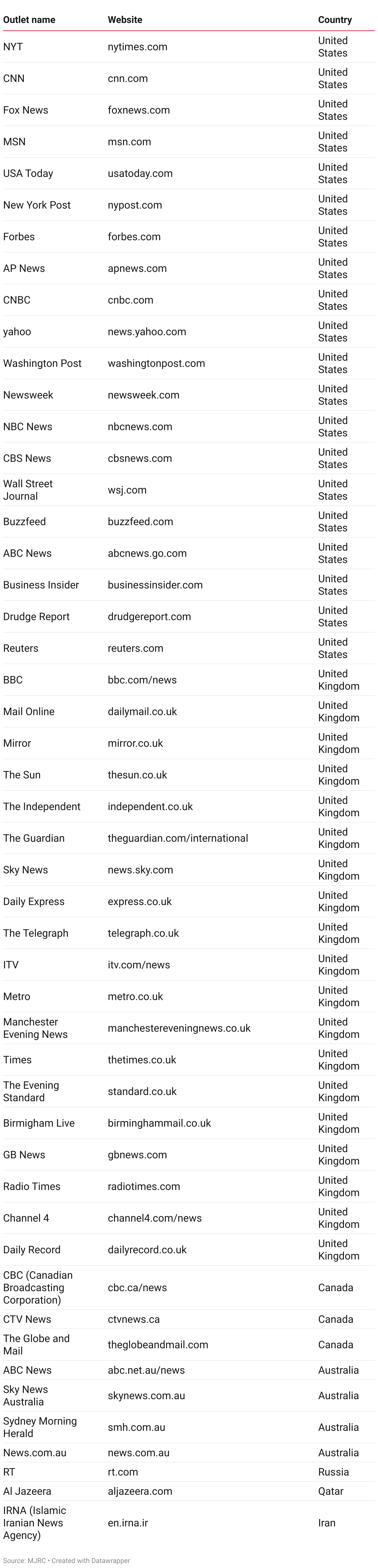 This study focuses on English-language media outlets from five key countries—the United States, the United Kingdom, Canada, Australia, and Ireland—chosen for their outsized role in shaping global information flows and their relevance in international reporting on humanitarian crises. These countries were selected based on linguistic accessibility, regional diversity, and their media systems’ influence in the Anglophone world.
