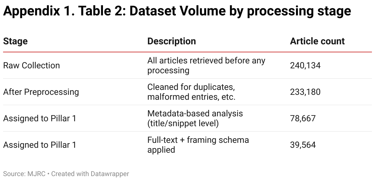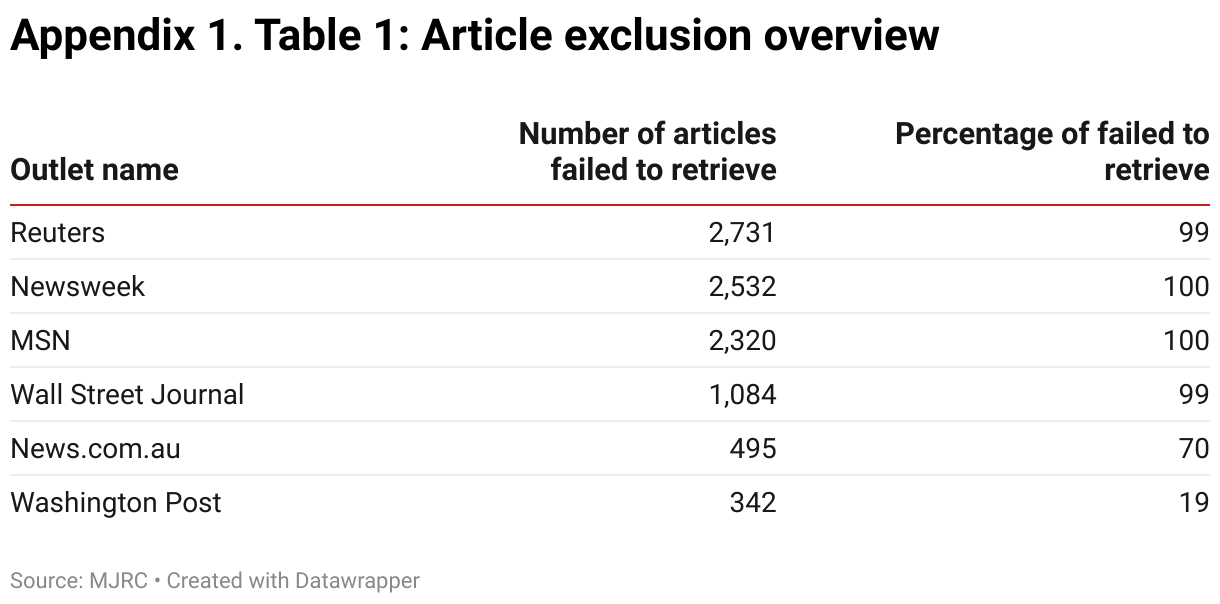 During the full-text extraction stage (see Appendix 1: Data Curation and Processing Framework), some outlets were excluded from qualitative analysis due to legal or technical constraints, such as strict rules or aggressive anti-bot measures. These exclusions are noted later in the document.