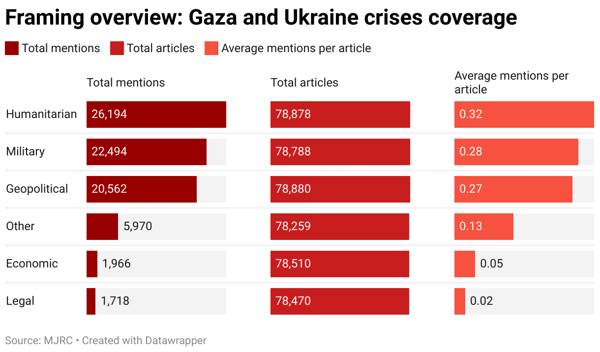 The framing analysis of the Gaza and Ukraine crises conducted as part of this project reveals that the humanitarian lens is the most dominant across media coverage. Articles prioritize imagery of suffering civilians, refugee stories, and basic needs, registering higher average mentions (0.316 per article) than military (0.281) or geopolitical (0.267) frames. However, while framed empathetically, these narratives risk oversimplifying multidimensional conflicts and depoliticizing structural injustices.